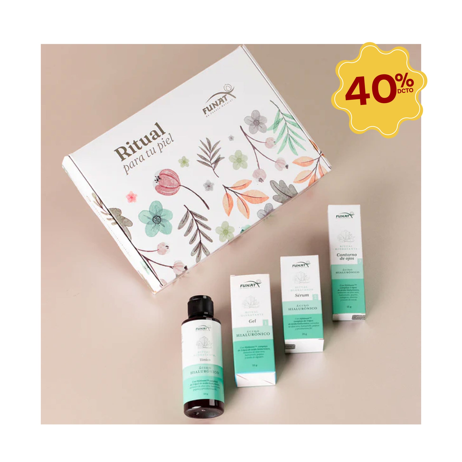 El ritual son 4 pasos de la refinada mezcla de ingredientes naturales, basado en las revolucionarias propiedades dermatológicas del ácido hialurónico, integrando 3 tipos distintos de ácido hialurónico en una exquisita mezcla botánica potenciadora, para brindar resultados rápidos y duraderos para tu piel; mejorando el aspecto y promoviendo un buen estado de la piel.
